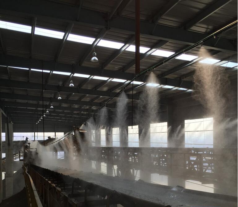 干霧抑塵系統(tǒng)/干霧抑塵設(shè)備利用壓縮空氣把水霧化為10微米以下的水霧,在起塵點(diǎn)上方形成霧團(tuán)完全罩住起塵點(diǎn),這樣在物料起塵的時(shí)候粉