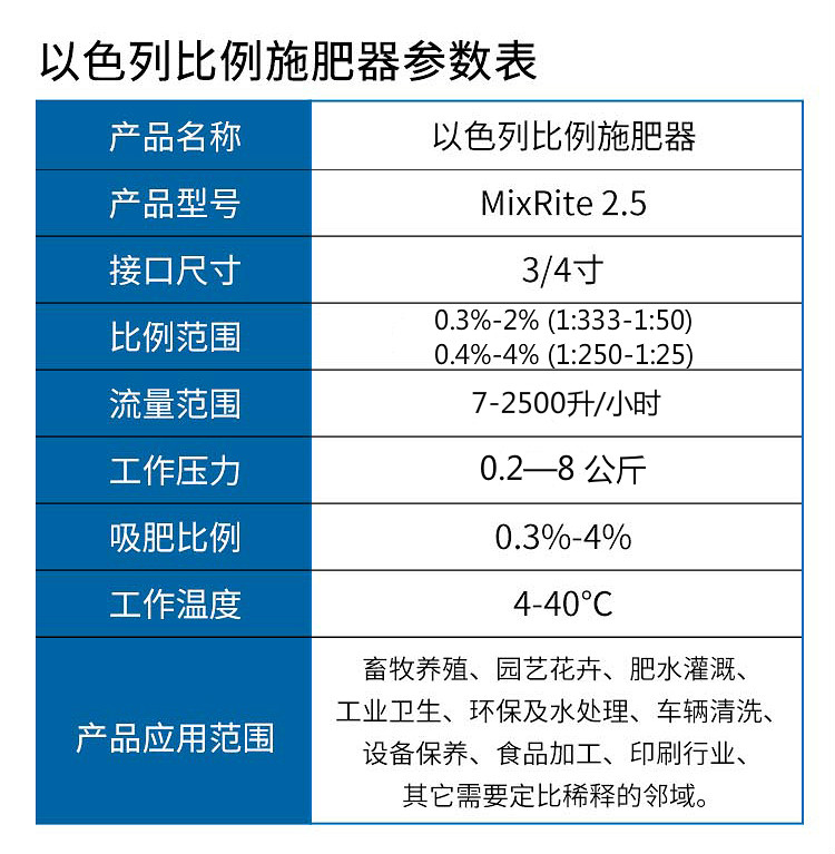 以色列泰芬(TEFEN)公司建立于1970年,公司致力于研究、開發(fā)、和制造應(yīng)用于農(nóng)業(yè)灌溉、醫(yī)藥、防疫和工業(yè)用途的先進(jìn)的水泵產(chǎn)品。MixRite(美瑞)牌水動注肥泵(又稱水動注肥器、比例施肥器)為以色列泰芬(TEFEN)公司在制造銷售的注冊產(chǎn)品商標(biāo)。